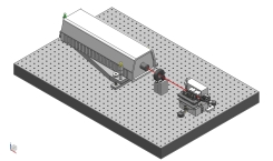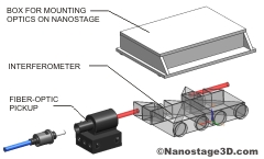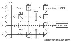 Development of a Differential Plane-Mirror Interferometer (DPMI). The interferometer is designed for the Nanostage3D translation stage but can be used as a stand-alone interferometer as well. Figure 1 gives the beam layout of the DPMI. A polarizing beamsplitter divides the incoming two-frequency laser beam into a reference beam and a measurement beam. Each beam is then reflected twice by its respective mirror before being recombined and coupled into a fiber-optic detector. Beamsplitters and wave plates separate the first and second pass. The optical length of the measurement beam and the reference beam are identical for maximum thermal stability. The DPMI measures only the relative translations along the mirror normal, this measurement is not influenced by other movements of the mirror or movements of the interferometer itself. The overall dimensions of the DPMI optics are 58 x 48 x 10 mm (figure 2). When used with Zygo® ZMI4004 measurement electronics the resolution is 0.15 nm. Part of the development process is the design and fabrication of assembly tooling (figure 3). |